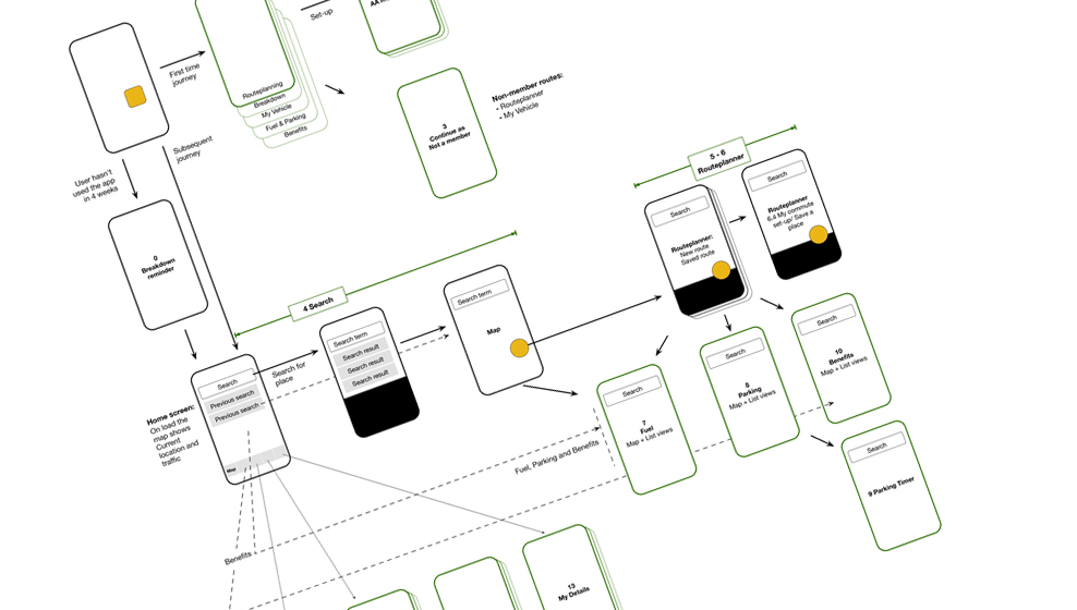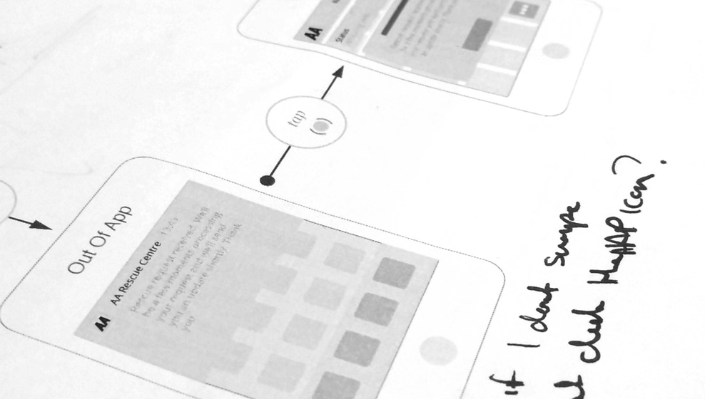 Before the actual legwork started, we partnered up with an innovations agency for a three day brainstorming session. The aim was not only to come up with a list of desired functionality and requirements, but to discuss how we could better serve AA customers through the App.